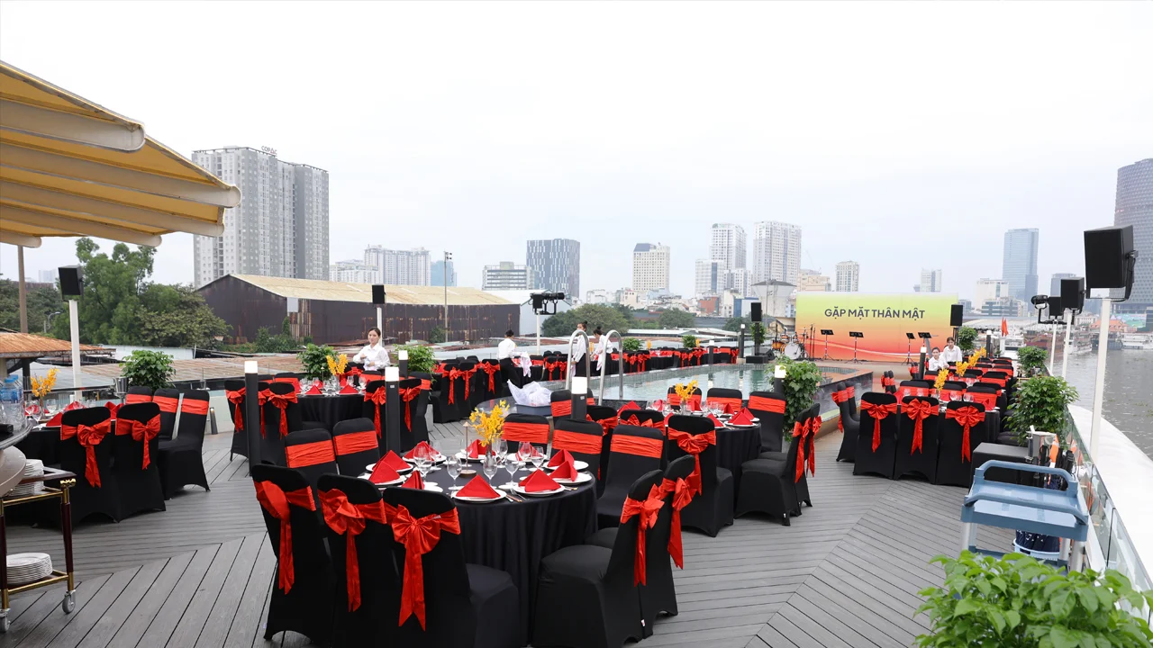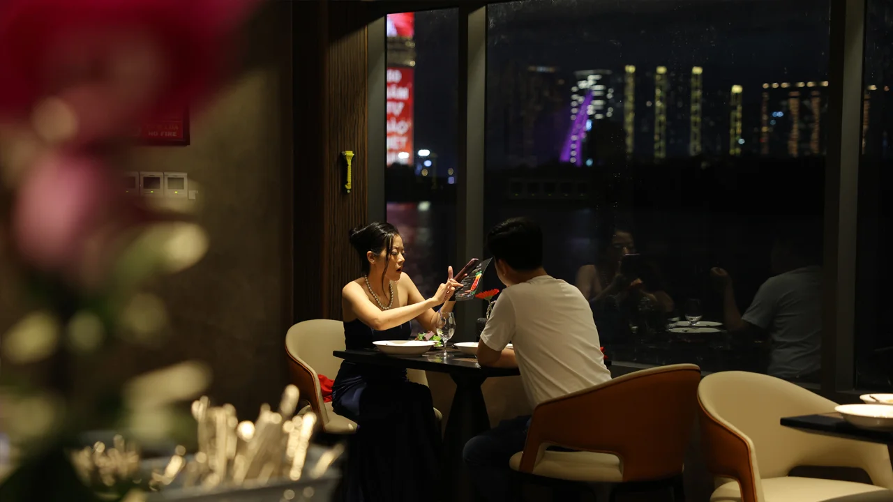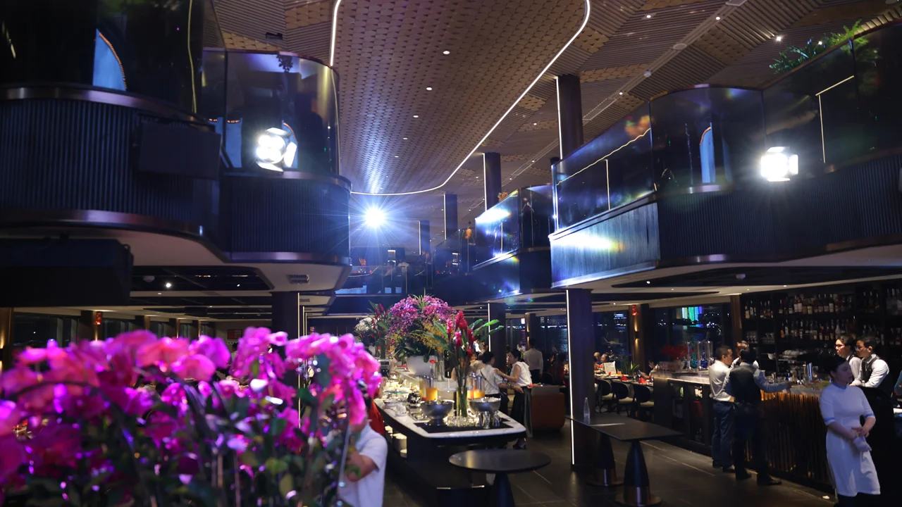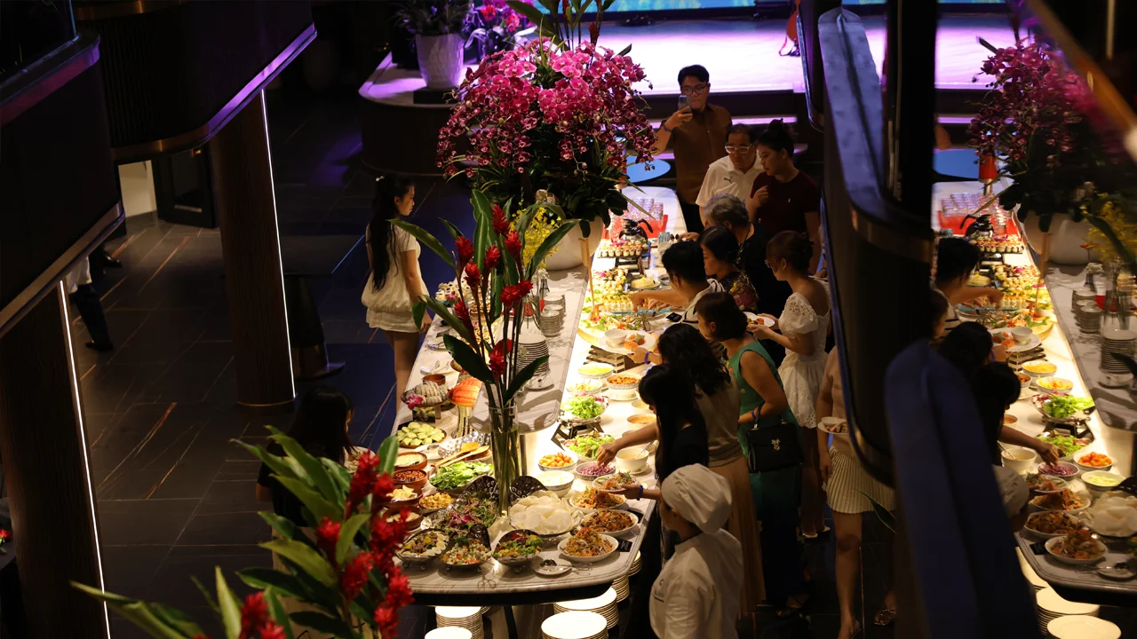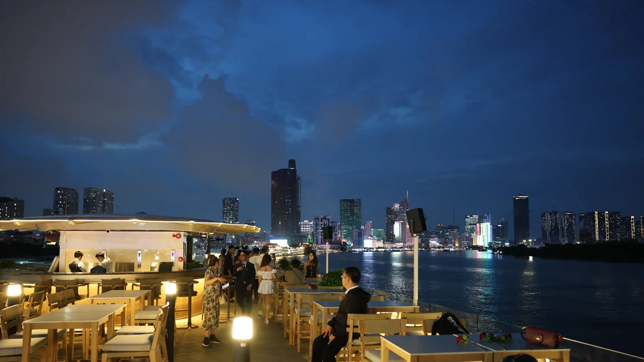 Guests are welcomed at the private dock with a refreshing cocktail and guided aboard The Elite of Saigon, an opulent yacht offering breathtaking views of the Saigon River. A brief introduction to the cruise’s elegant interiors sets the tone for an unforgettable evening.