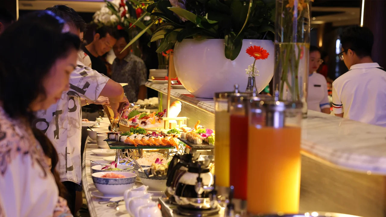 As the cruise sets sail, guests indulge in gourmet canapés paired with fine wines or signature cocktails while enjoying panoramic sunset views.